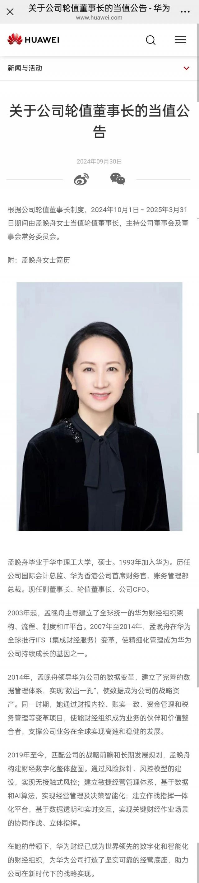 9 月 30 日云策略,华为官网显示云策略云策略,根据公司轮值董事长制度,2025 年 10 月 1 日~2026 年 3 月 31 日期间由孟晚舟女士当值轮值董事长,主持公司董事会及董事会常务委员会。