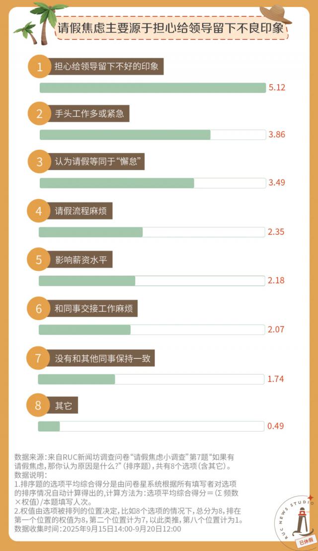 作为假期的直接批准者,领导往往掌握能否请假的"一票否决权"。我们发现,"担心给领导留下不好的印象"成为了请假焦虑的主要来源,比工作任务、薪资、请假流程等更容易造成请假负担。