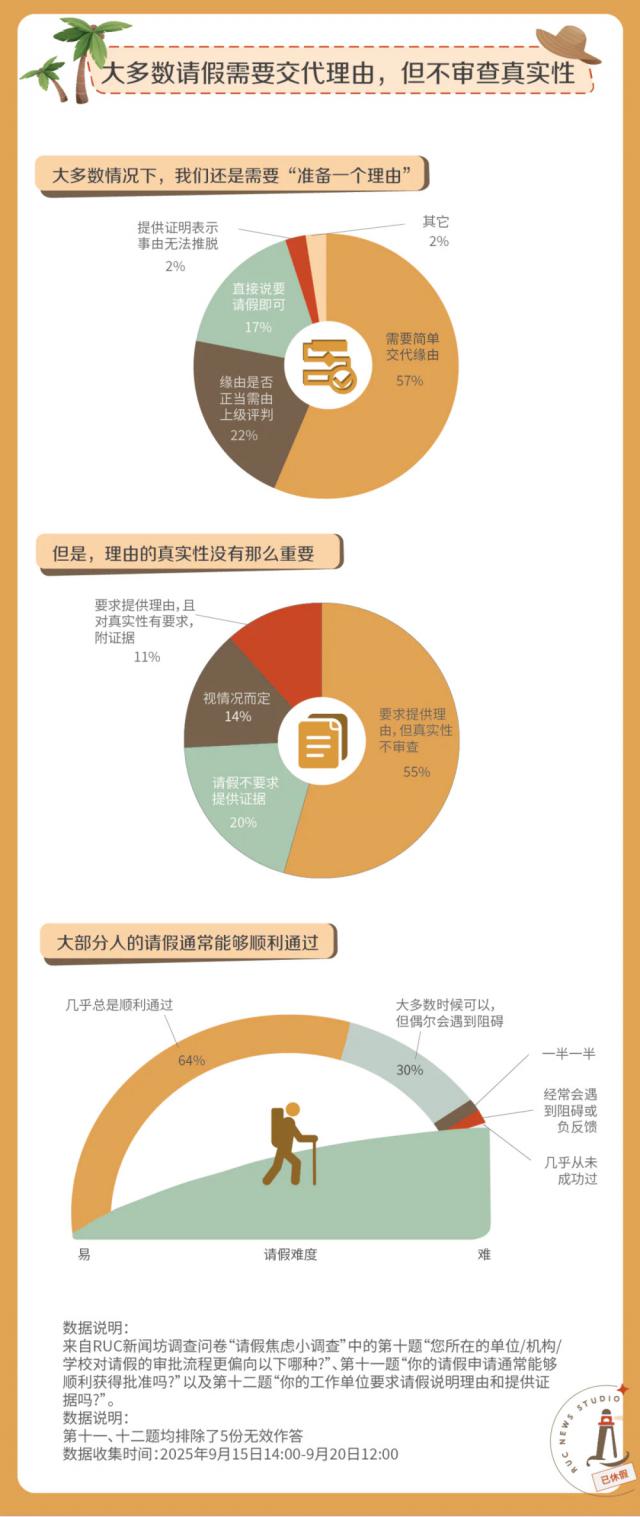 问卷结果显示,除了少数"神仙单位"只需提出申请即可休假外,大部分单位仍需交代请假理由并完成审批流程。而在不同单位之间,对请假理由的要求和审批流程的繁琐程度又存在差异。