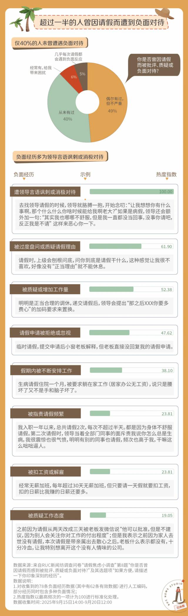这些焦虑并非空穴来风,而是"吃一堑长一智"的教训。问卷结果显示,有超过一半的人曾因请假而遭受到言语讽刺、过度盘问、质疑、拒绝和惩罚等负面对待。