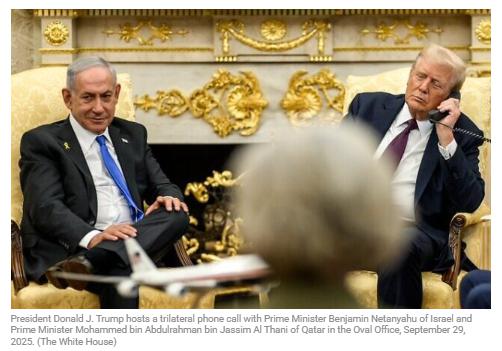 电话这头,内塔尼亚胡为以色列 9 月初空袭多哈、侵犯卡塔尔主权的行为正式道歉,并对一名卡塔尔安全官员在袭击中丧生表示"深切遗憾"。他承诺以色列将向遇难者家属支付赔偿,并保证未来不再进行此类袭击。